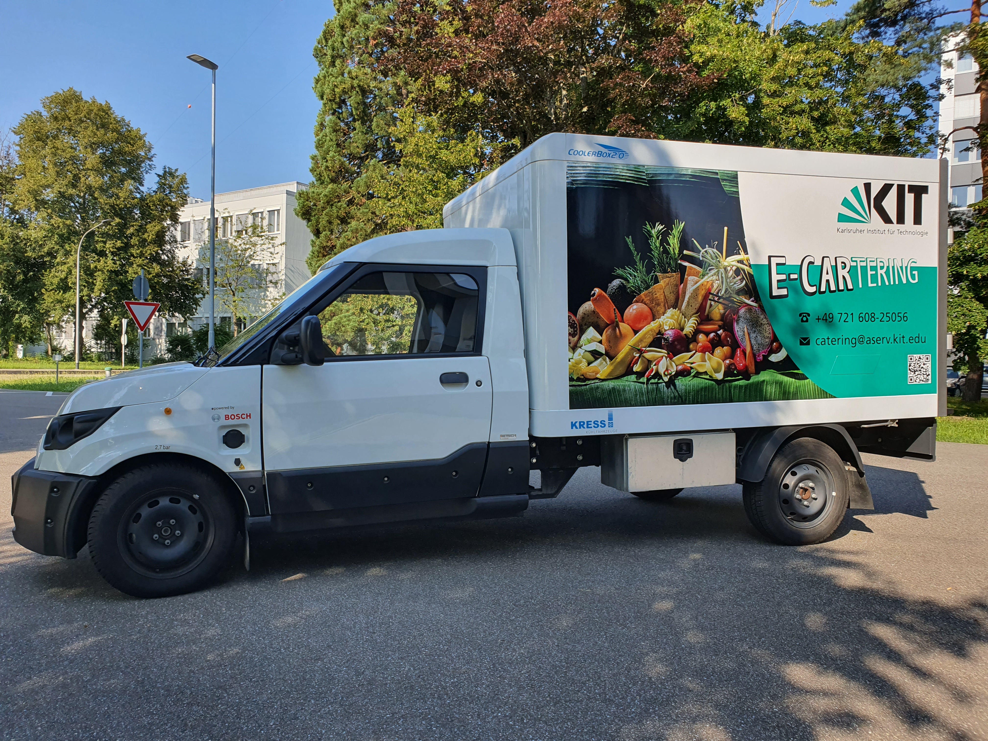 Für die Belieferung von Veranstaltungen am KIT haben wir ein Elektroauto im Einsatz. Das Auto erreicht eine Höchstgeschwindigkeit von 85 km/h und hat eine Reichweite von 80 km. Die Dauer-/Peakleistung unseres E-Autos beträgt 34 kW/ 48 kW.